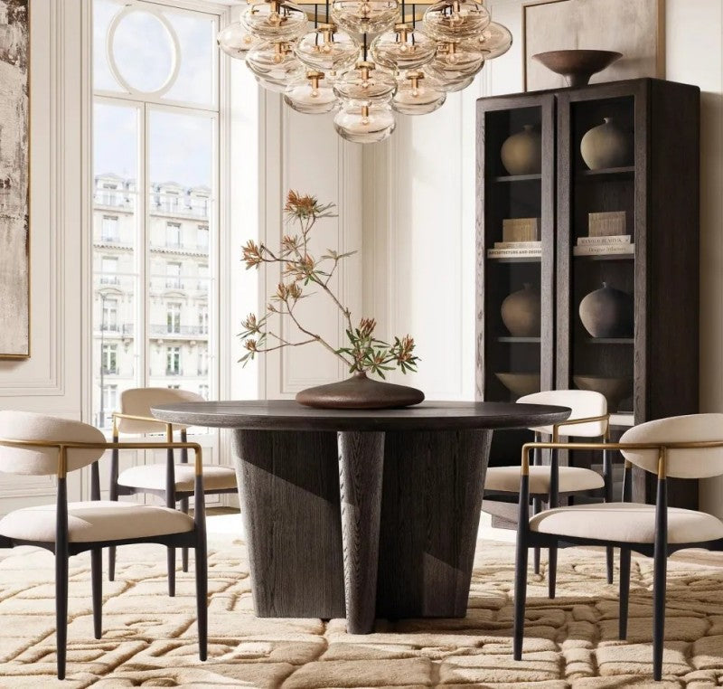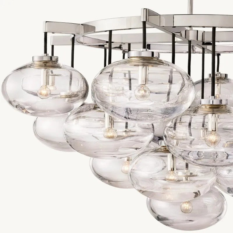 Handblown oval glass shades seem to float overhead in the Cabretti collection. Held by an industrial metal frame, the globes are suspended from black cords, marrying clean geometry with understated elegance.
