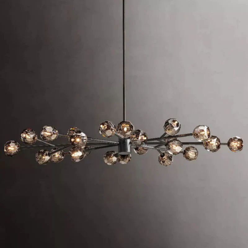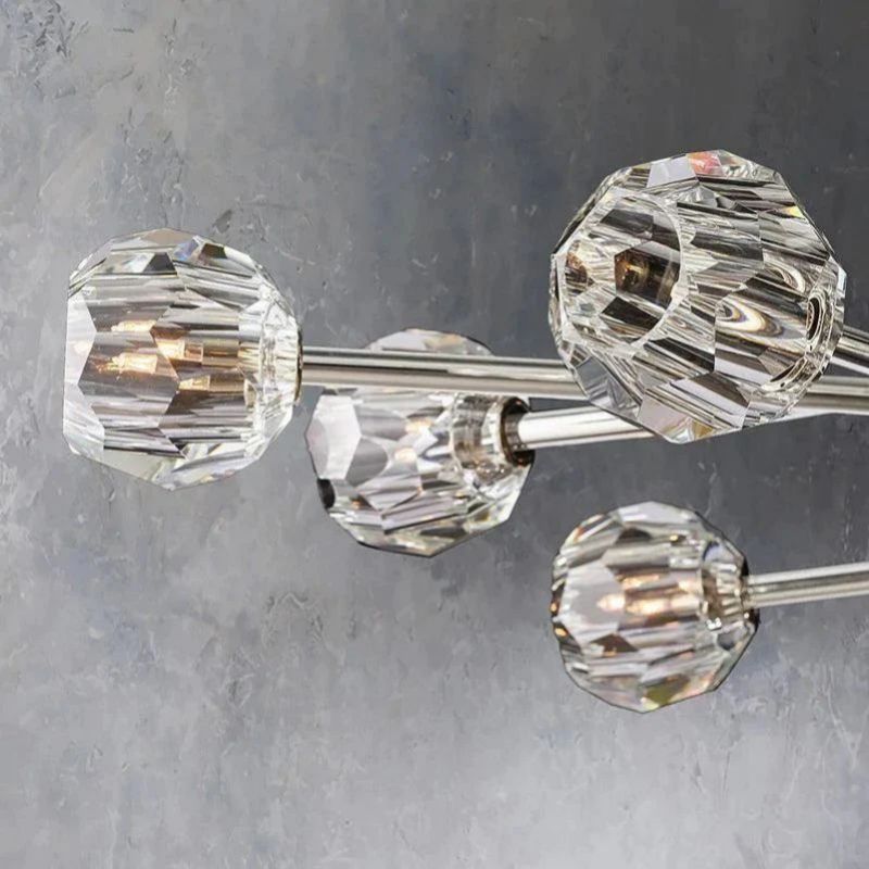The collection crafted of solid brass and crystal glass,  for luxe materials and superior craftsmanship, each finely faceted sphere is ground and polished by hand to reflect and refract the light.