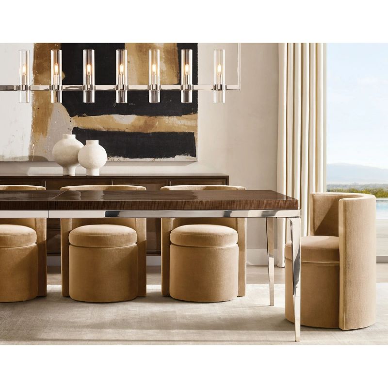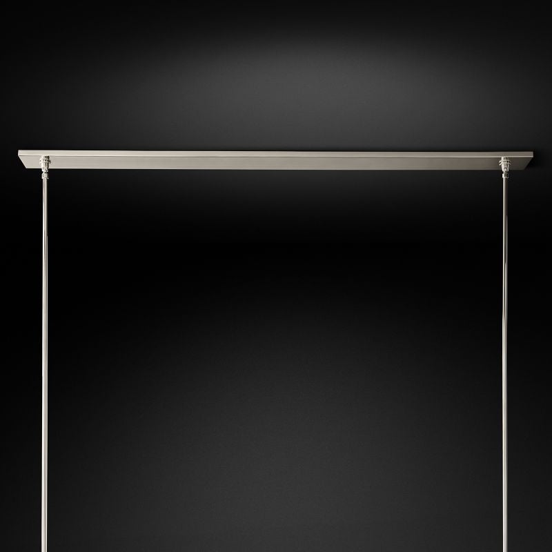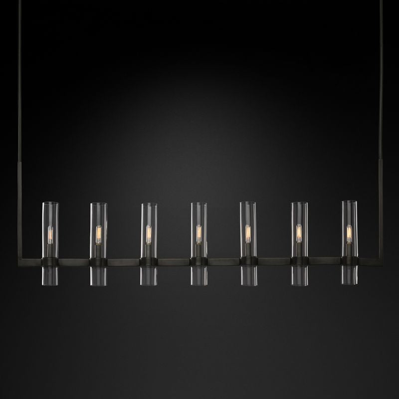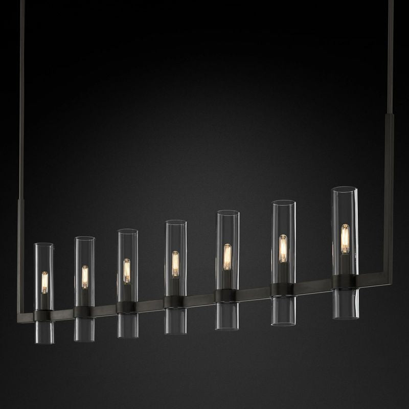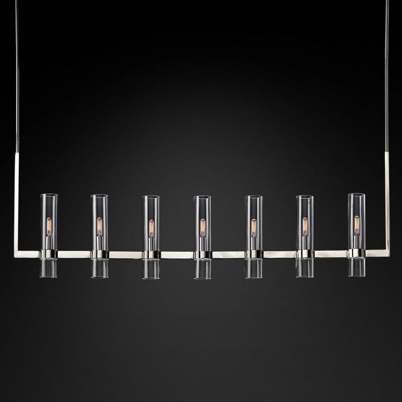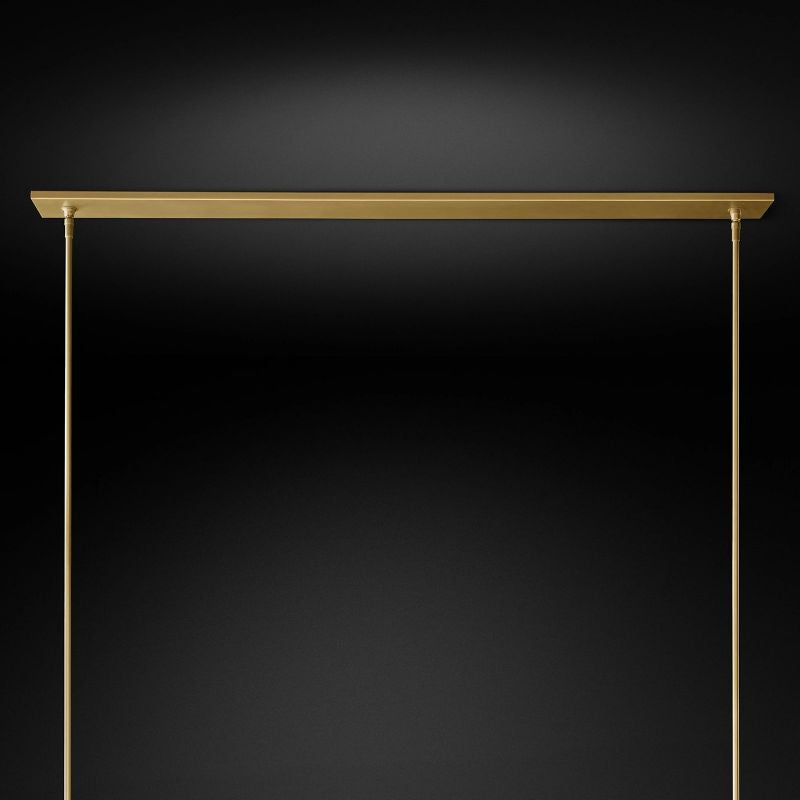 Embrace modern sophistication with the Contemporary Linear Chandelier – a sleek fusion of brass and glass that illuminates your space with style.