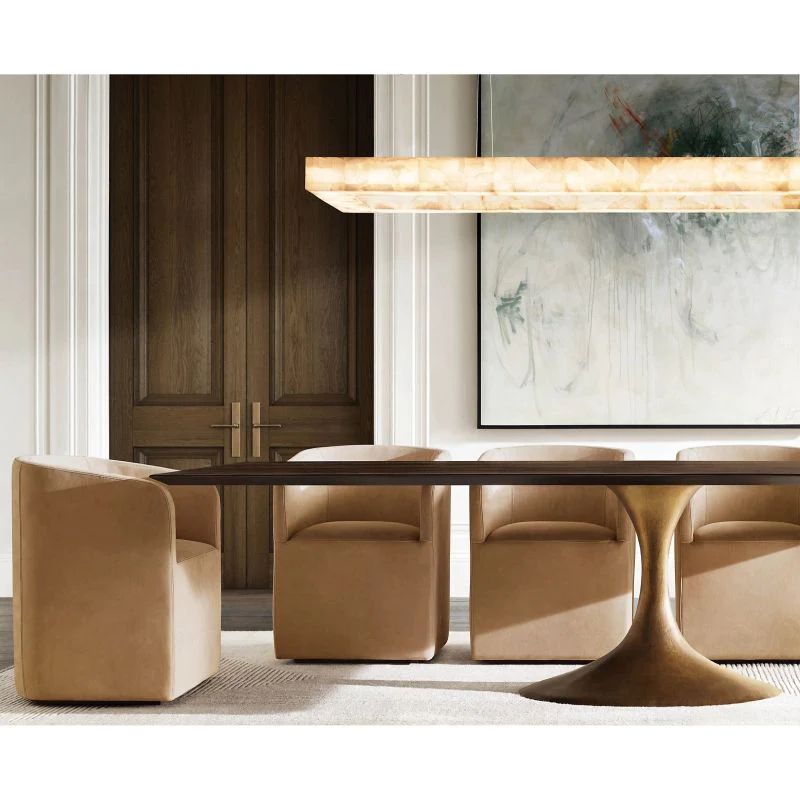 A collection of chandelier with minimal shapes and striking effects, highlighting the beauty of calcite, a translucent stone that radiates a warm, natural glow. Halos of polished stone are suspended from slender steel cables, artfully stitched together to create a smooth, continuous surface, while subtle lighting inside accentuates the organic colors and textures. Each luminaire is a unique statement.