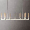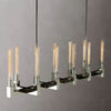 The collection chandelier is reinterpreted in brass and defined by clean lines and sharp angles, the fixture's elegant ribbed-glass hurricanes showcase Edison filament bulbs, shimmering like candles within.