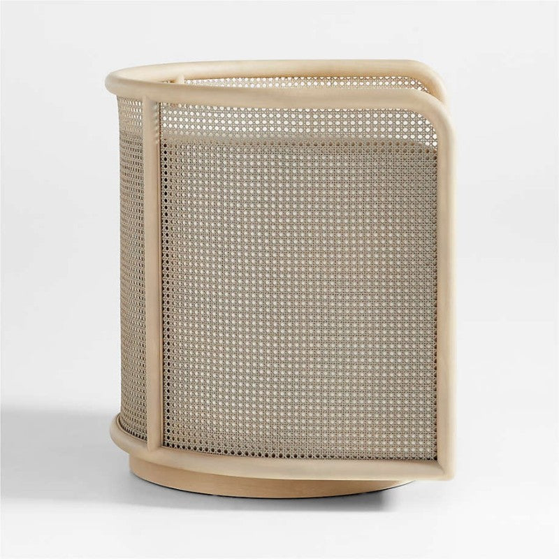 Classic bentwood and retro caning shape the breezy curves of our Fields swivel chair, a contemporary take on the traditional barrel chair. Sustainably sourced hardwood flows the seamless design, integrating back, armrest and leg into one fluid silhouette. Upholstered in white to complement the whitewashed wood, the tight back and cushion seat snuggle in for a comfy yet upright sit. A recessed swivel base lets the accent chair turn a full 360 degrees, making Fields a great choice to unite layouts or create a room within a room.