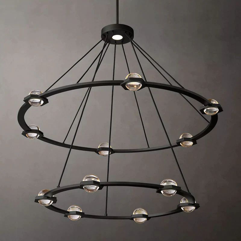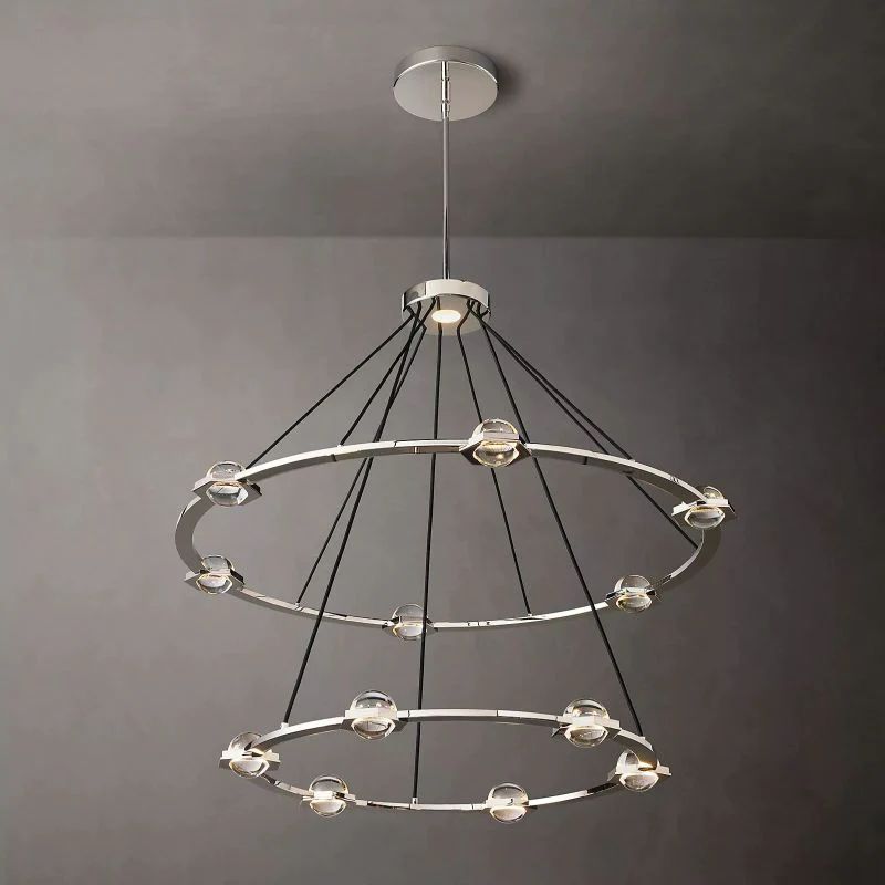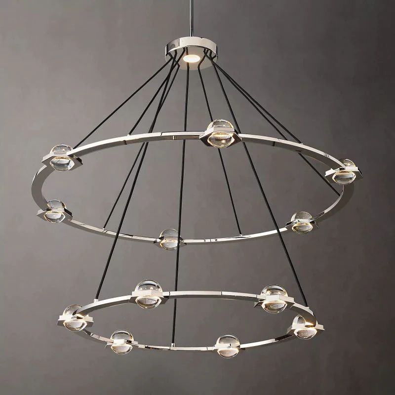 The collection features lighted crystal orbs, suspended in hexagonal fittings within a flat metal frame. The design was inspired by plans for the cenotaph of Sir Isaac Newton drawn by 18th-century architect Etienne Louis Boullée, a visionary ode to physics reinterpreted in a stunning contemporary form.