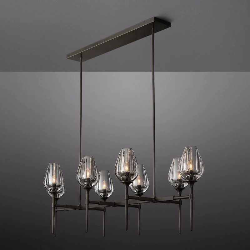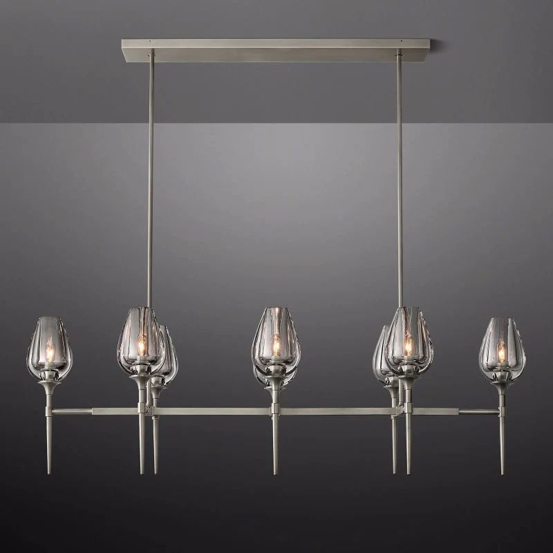 The form of a tulip in bloom inspired this collection. Lathe-carved from solid blocks of crystal and then hand polished, the glass torchieres' graduated thickness captures a petal's delicate contours while casting a warm, atmospheric glow. An understated brass armature secures the fluid forms, evoking stems fixing the ephemeral flowers in space.