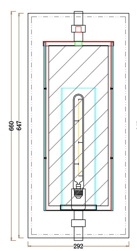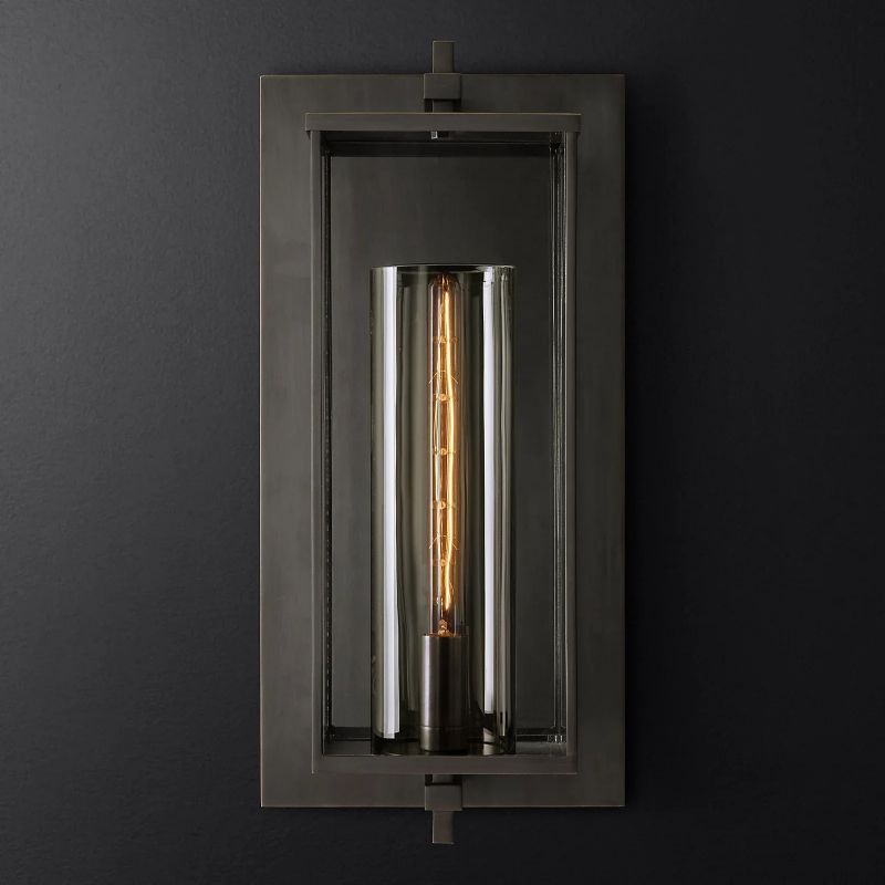 | The lamp is on a square crossbar away from the wall, in a glass box that seems weightless. The clear glass shade gives the impression of a pillar candle, with the bulb clearly visible inside. It is both simple and flamboyant. |