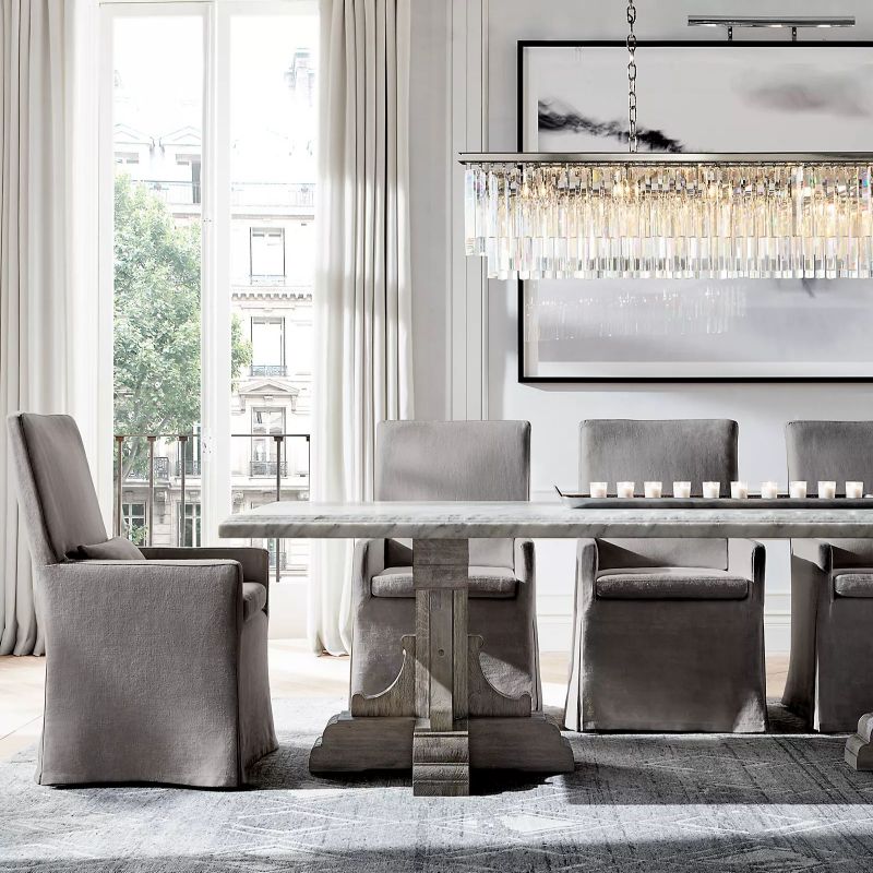 | Inspired by the Art Deco style of 1920s Paris, the collection captures the period's fascination with geometric forms. Masterfully refracting the light, hundreds of faceted, dynamic prisms evoke the allure of the era. Hanging like lush fringe from a welded iron frame, the angular glass juxtaposes elegance and industrialism. |