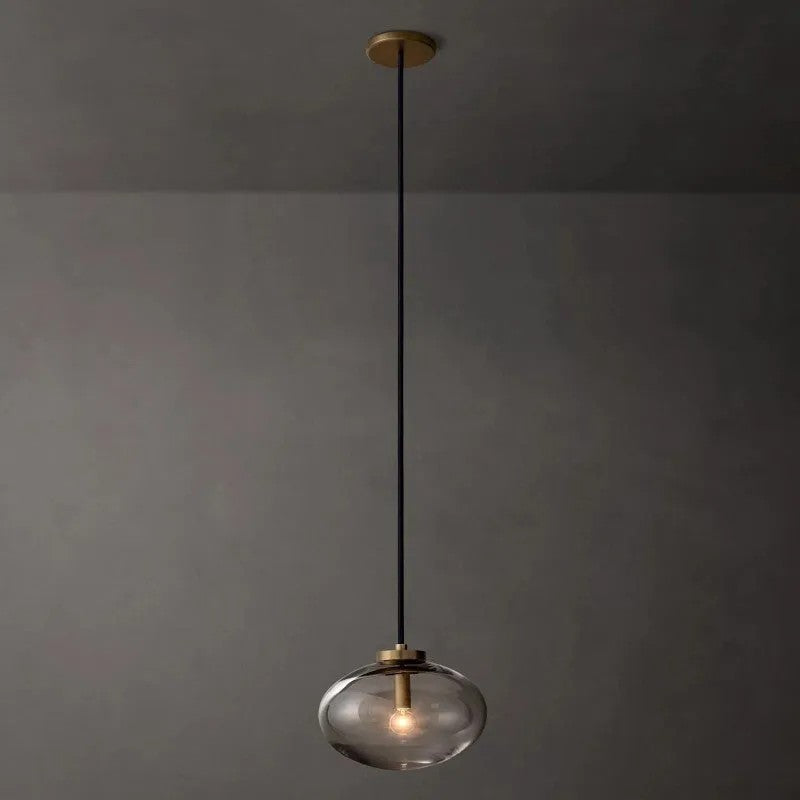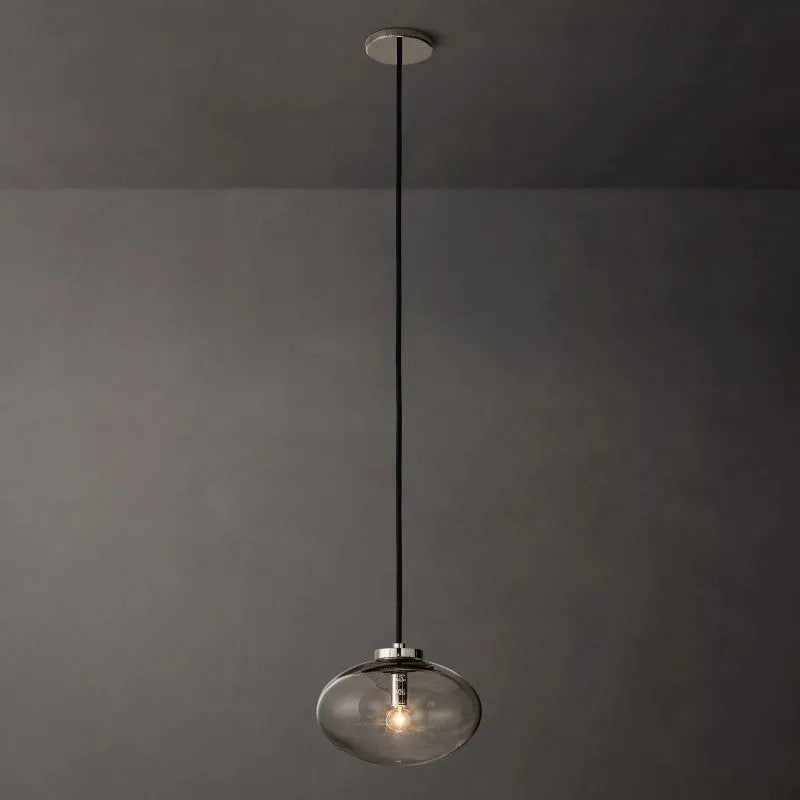 Handblown oval glass shades seem to float overhead in the Cabretti collection. Held by an industrial metal frame, the globes are suspended from black cords, marrying clean geometry with understated elegance.