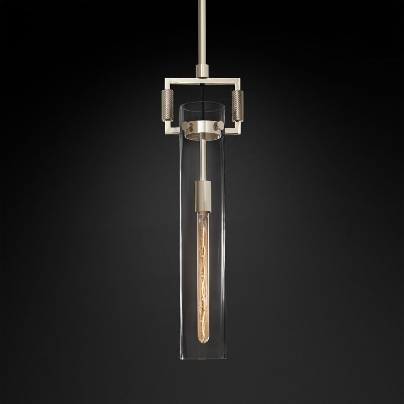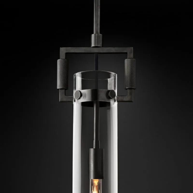 Crafted of solid metal, the geometric yoke reveals its industrial inspiration. In contrast, the clear glass surround is barely there, echoing the form of a shade. An ultra-slim Edison bulb housed within reveals arresting filaments of light.