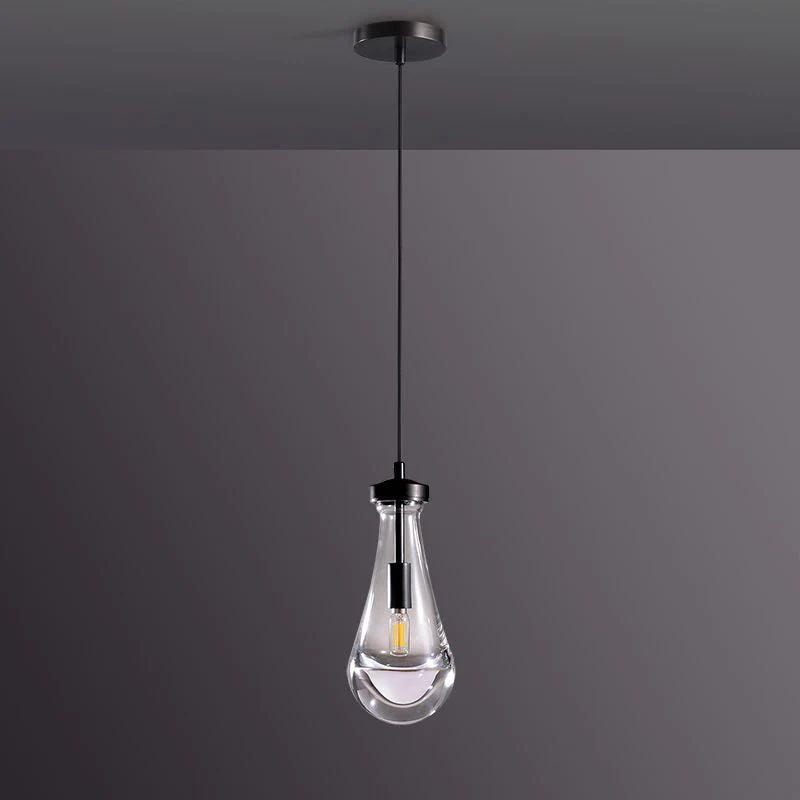Much like the rhythm of a rainstorm itself. Suspended from slim black cords, drops of blown glass encase the bulbs – creating the illusion of underwater illumination – and cast luminous ripples that wash across ceilings and walls.
